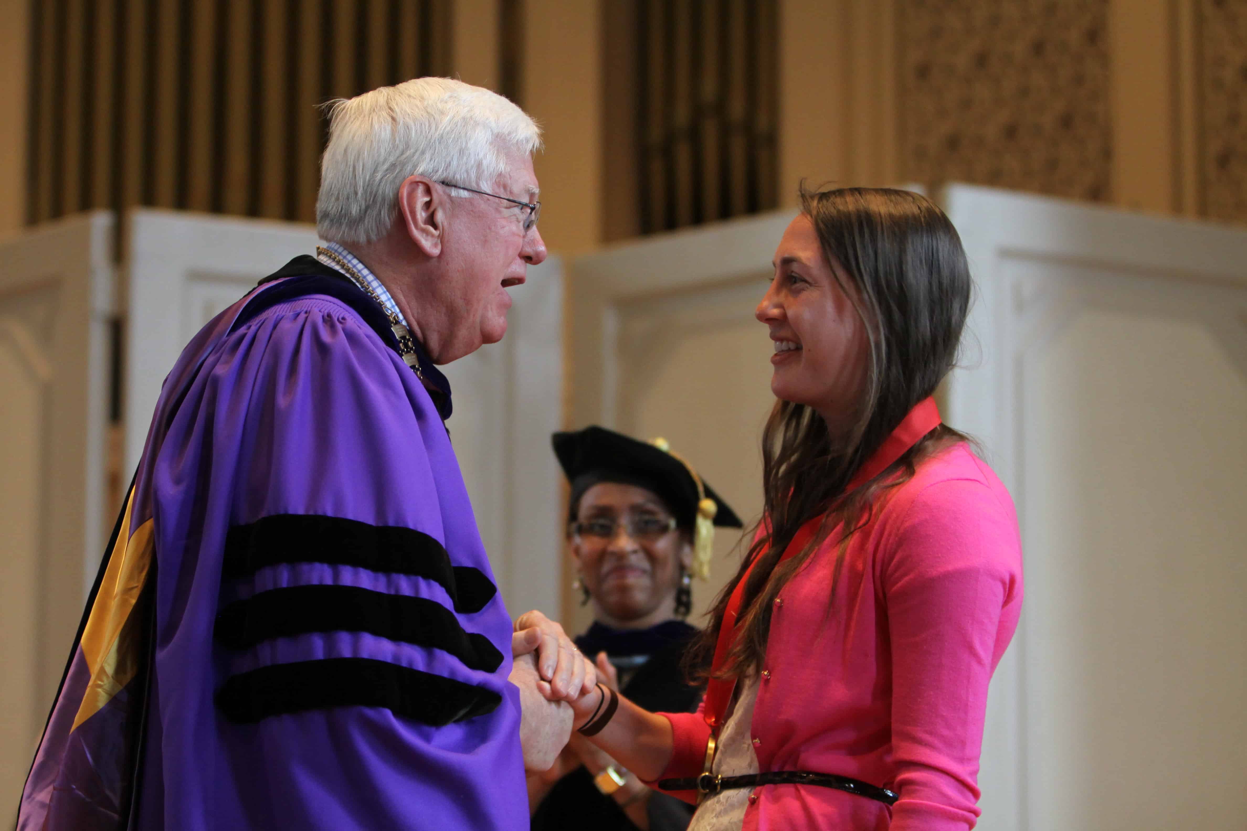 She said, “It’s incredible to reflect on how much has changed over four years: Faculty members who were then strangers are now friends. The words of the alma mater which were then unfamiliar are now a part of me. The nervous prospective student in the pew is now almost a graduate.”